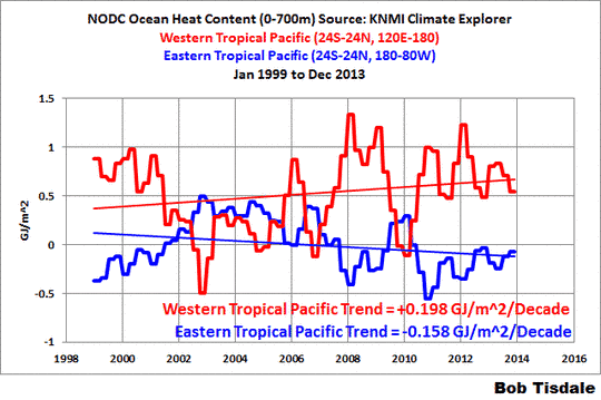Ihrer Argumentation zufolge sollte der ozeanische Wärmegehalt des westlichen tropischen Pazifiks während der Periode des Stillstandes zunehmen. In einer Ihrer jüngsten Studien schreiben Sie, dass der Stillstand im Jahre 1999 begonnen hatte, und zwar mit dem Übergang der Pazifischen Dekadischen Oszillation von der positiven in die negative Phase. Sie haben das als Proxy für die ENSO-Zustände verwendet. Abbildung 1 zeigt den NOCD-Wärmegehalt des Ozeans im westlichen tropischen Pazifik (24°S – 24°N; 120°E – 180°); Wassertiefe 0 bis 700 m, Zeitraum Januar 1999 bis Dezember 2013. Man erkennt, dass sich der westliche tropische Pazifik tatsächlich bis zu einer Tiefe von 700 m erwärmt hat.