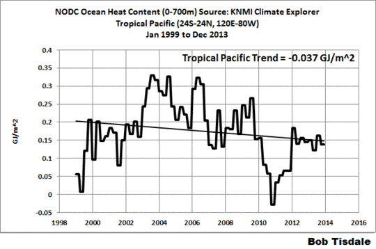 Die NODC-Daten des ozeanischen Wärmegehaltes (0 bis 700m) des östlichen tropischen Pazifiks, einer viel größeren Region, zeigen von 1999 bis 2013 eine Abkühlung, siehe Abbildung 3.