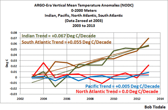 Auch habe ich in meinem letzten Beitrag If Manmade Greenhouse Gases Are Responsible for the Warming of the Global Oceans… die vertikalen mittleren NODC-Temperaturanomalien gezeigt für den Indischen, Pazifischen, Nord- und Südatlantischen Ozean für Tiefen zwischen 0 und 2000 m während der ARGO-Ära (Beginn 2003). Abbildung 5 ist eine Aktualisierung dieser Illustration, die auch die vor kurzem veröffentlichten Daten für 2013 enthält. Der flache Verlauf des pazifischen Trends zeigt, dass es dort nicht zu einer substantiellen Zunahme der Temperatur unterhalb der Oberfläche des Pazifiks bis zu einer Tiefe von 2000 m während der letzten 11 Jahre gekommen war… und das gilt auch für den Nordatlantik. Menschliche Treibhausgase können die Erwärmung im Südatlantik und dem Indischen Ozean nicht erklären, hat diese doch offensichtlich keinen Einfluss auf die Erwärmung im Nordatlantik und Pazifik bis 2000 m Tiefe während der letzten 11 Jahre.