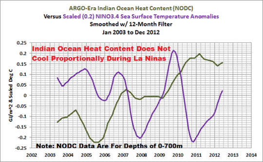 Warum hat sich der Indische Ozean während der ARGO-Ära erwärmt? In Abbildung 6 werden die Daten des ozeanischen Wärmegehaltes im Indischen Ozean (90S-90N, 20E-120E) mit den skalierten Wassertemperatur-Anomalien des NINO3.4-Gebietes im äquatorialen Pazifik verglichen. Beide Datensätze wurden mit einem 12-monatigen laufenden Filter geglättet. Die NINO3.4-Daten sind ein allgemein gebräuchlicher Index für Zeit, Stärke und Dauer von El Niño- und La Niña-Ereignissen. Der Wärmegehalt des indischen Ozeans nimmt als Folge von El Niño-Ereignissen zu, kühlt sich aber offenbar nicht in gleicher Weise ab bei La Niña-Ereignissen.