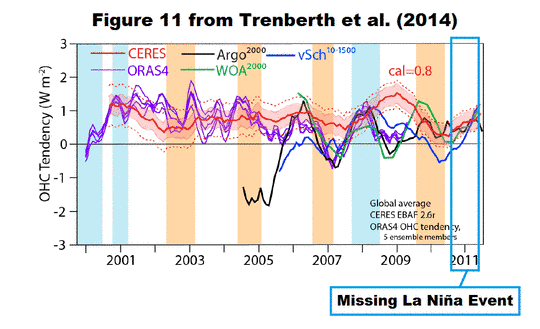 Danke für das Verlinken eines Vorabdrucks von Trenberth et al. (2014) “Earth’s Energy Imbalance” in ihrem Beitrag auf SkepticalScience. Leider hatte ich keine Gelegenheit, ihn im Detail zu studieren. Aber ich habe ihn überflogen. Danke auch für die Nennung einer Anzahl von Datensätzen des Wärmegehaltes zusätzlich zu den Daten von ECMWF ORA-S4. Wir haben die Probleme dieser Re-Analyse in vielen Beiträgen diskutiert, die am Beginn dieses Beitrags gelistet sind, so dass ich hier damit jetzt nicht fortfahre… obwohl ich bemerke, dass Sie immer noch versuchen, die Verwendung der ORA-S4-Reanalyse zu rechtfertigen, indem Sie zeigen, dass sie auf vulkanische Aerosole reagieren, während dies bei anderen Datensätzen nicht der Fall ist. (Das ist keine Überraschung, ist doch die ORA-S4-Reanalyse das Ergebnis eines Computermodells, das man so programmiert hatte, dass es eine Abkühlung durch vulkanische Aerosole erzeugen soll).