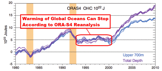 Und niemand sollte sich Sorgen machen über die beobachtete Erwärmung der Ozeane, wenn wir bedenken, dass sich die Erwärmung der globalen Ozeane der ORA-S4-Reanalyse zufolge, die Sie immer präsentieren, fast ein Jahrzehnt lang abschwächen kann. Siehe meine Abbildung 9, welche eine kommentierte Version der ersten Graphik ist, die Sie in Ihrem Blogbeitrag zeigen.