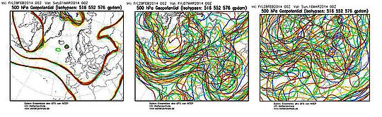 Mittel- und langfristig und vor allem in Klimazeiträumen liegt Dr. Ball jedoch richtig, wie ich mit folgenden drei Abbildungen zeigen möchte. Sie geben Ensemble-Vorhersagen von einem gegebenen Ausgangspunkt (heute) für 24 Stunden, 168 Stunden (1 Woche) und 384 Stunden (über zwei Wochen). Man erkennt: Nach 24 Stunden gibt es gute Übereinstimmung, nach 1 Woche kann man vielleicht noch ein Muster erkennen, aber bei 384 Stunden ist definitiv Feierabend.