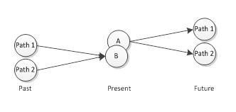 Diese Eigenschaft ist nicht auf Licht beschränkt; man kann sie auch bei anderen Partikeln beobachten. Die Auswirkungen sind enorm. Punkt A hat mehr als eine mögliche Zukunft und Punkt B mehr als eine mögliche Vergangenheit. Rearrangieren wir unser Doppelschlitz-Experiment so, dass A und B sich mit der Gegenwart decken, bekommen wir: