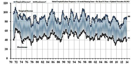 Besonders hervorgehoben wird in der WMO Presseerklärung der Taifun “Haiyan”, der im letzten Jahr auf den Philippinen große Verwüstung angerichtet hatte. Wobei sich die WMO dabei auf recht dünnes Eis begibt. Denn auch wenn solche Stürme“konsistent mit dem sind was man wegen der menschengemachten Erwärmung erwarten würde” sind, spricht doch der gemessene Trend der letzten Jahre eine völlig andere Sprache. Obwohl es seit den frühen 70er Jahren unbestreitbar wärmer geworden ist, ist bei der Energie und Anzahl der tropischen Stürme in diesem Zeitraum eher ein Rückgang als ein Anstieg zu erkennen (Abbildungen links, klicken zum  vergrößern).
