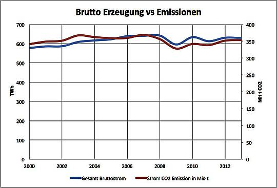 Abb. 2. Verlauf der Brutto Elektro-Energie Produktion und Elektroenergie bedingte CO2 Emissionen. Auffällig ist der unbedingte Gleichlauf beider Größen. Quelle Statista Erhebung durch BDEW, Statistisches Bundesamt, AGEB