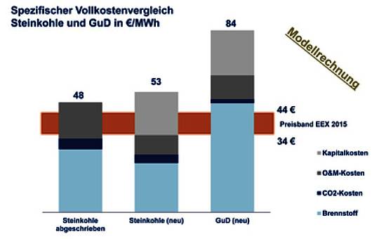 Bild 3. Aktuelle Kostensituation konventioneller Kraftwerke. Aufgrund der niedrigen Preise an der Strombörse EEX lassen sich selbst abgeschriebene Steinkohlekraftwerke nicht mehr kostendeckend betreiben (O&M = Kosten für Betrieb und Instandhaltung) (Grafik: [PREI])