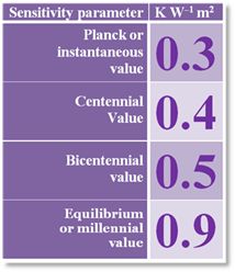 Das IPCC sagt, dass es seit 1750 einen anthropogenen Antrieb von 2,3W/m² und einen geringen natürlichen Antrieb gegeben habe. In diesem Falle ist der Klimasensitivitäts-Parameter einfach der Quotient aus der Erwärmung um 0,9 K seit 1750 geteilt durch 2,3 W/m² oder 0,4 K m²/W. Da der größte Teil des Antriebs seit 1750 im vorigen Jahrhundert aufgetreten ist, liegt der Wert im richtigen Bereich und ist in etwa gleich dem Jahrhundert-Sensitivitäts-Parameter in Tabelle 2.