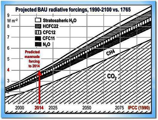 Im Jahre 1990 hat das IPCC vorhergesagt, dass sich der anthropogene Antrieb durch Treibhausgase seit 1765 bis zum Jahr 2014 auf 4 W/m² bei Business as Usual belaufen würde (Siehe Abbildung 1)