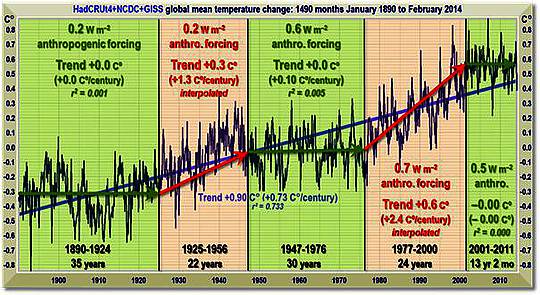 Abbildung 3: Monatliche globale Temperaturanomalien und –trends von Januar 1890 bis Februar 2014 als das Mittel der globalen mittleren Temperaturanomalien von GISS, HadCRUT4 und NCDC, zusammen mit Unter-Trends während der negativen oder Abkühlungsphase (grün) bzw. positiven oder Erwärmungsphasen (rot) der PDO. Die Daten der Phasen werden bereit gestellt durch dieses Institut. Anthropogene Strahlungsantriebe sind Aufteilungen des anthropogenen Antriebs von 2,3 W/m² von 1750 bis 2011, basierend auf dem IPCC (2013, Abbildung SPM.5.).