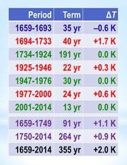 Tabelle 3: Perioden mit Abkühlung (blau) Erwärmung (rot) und ohne Trend (grün) seit 1659. Infolge von Unsicherheiten in der Temperaturaufzeichnung in Zentral-England könnte es in den 91 Jahren vor 1750 zu einer stärkeren Erwärmung gekommen sein als in den dreieinhalb Jahrhunderten danach.