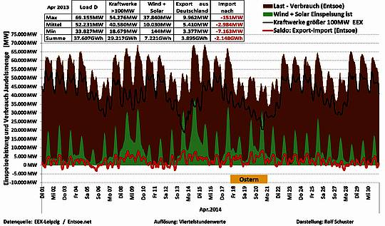 Abbildung 3: Solar + Windeinspeiseleistung im April mit benötigter Gesamt-Leistung; Datenquelle EEX, Grafik R. Schuster
