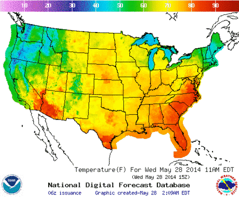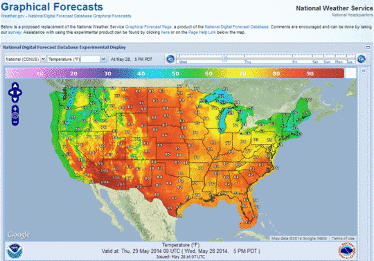 Unten ist eine andere Darstellung der graphischen Vorhersageseite des National Weather Service, ein Erzeugnis der National Digital Forecast Database. Kommentare sind willkommen.