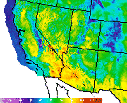 Grund hierfür ist, dass eine kleine Nische mit Temperaturwerten über 110°F [ca. 38°C] in der Karte aus dem Jahr 2008 auftaucht, und zwar im und nahe beim Death Valley (Ansicht unten vergrößert und mit einem Pfeil versehen, so dass es auch richtig hervortritt).