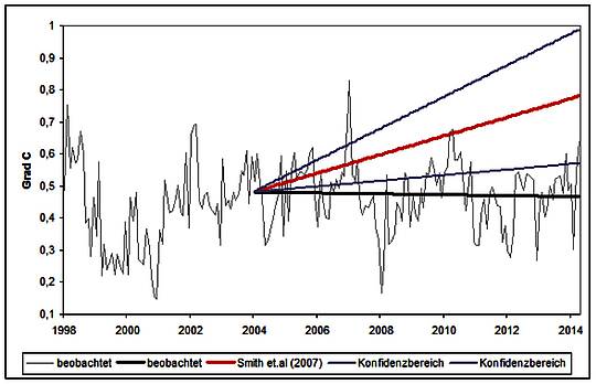 Bild 1: Die dekadische Vorhersage von Smith et al. (2007) für den Zeitraum bis 2014 (Quelle: Bild 4 der o.g. Arbeit)