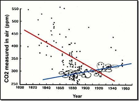 Zwei kritische Situationen standen im Mittelpunkt, das atmosphärische CO2-Niveau zu kontrollieren. Wir wissen, dass Guy Stewart Callendar, ein britischer Dampfmaschinen-Ingenieur, die niedrigen Zahlen aus 90.000 atmosphärischen CO2-Messungen im 19. Jahrhundert herausgepickt hatte. Dies etablierte nicht nur ein geringes vorindustrielles Niveau, sondern veränderte auch den Trend des atmosphärischen Niveaus (siehe folgende Abbildung:)