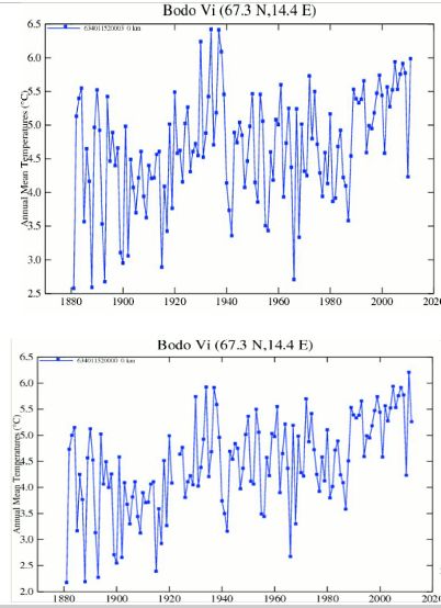Ganz ähnlich sieht die Situation übrigens in Norwegen aus. Hier eines der bekannten Vorher-Nachher-Charts von Steven Goddard: