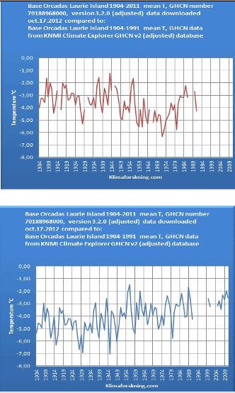 Auch aus der Antarktis sind beeindruckende und erwärmende Korrekturen zu vermelden. Roger Andrews brachte dazu im Tallbloke-Blog eine schöne Vorher-Nachher-Graphik: