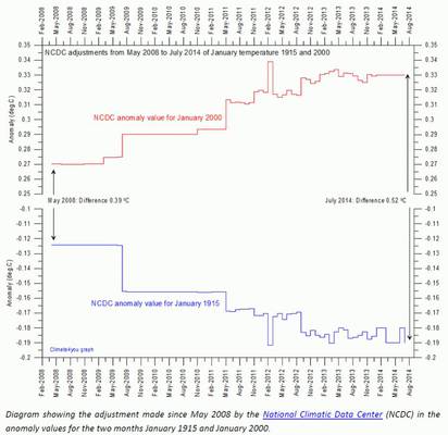 Wenn man die Vielzahl der lokalen Korrekturen zusammenrechnet, kommt in der globalen Summe ein schöner Batzen zusammen. Ole Humlum von Climate4you zeigte im Juni-2014-Klimarundschreiben eine überraschende Graphik, in der die Entwicklung des Korrekturfaktors im Laufe der letzten 6 Jahre dargestellt wird (Abbildung unten). Während der Januar 2000 stetig künstlich wärmer gemacht wurde, gedachte man dem Januar 1915 das genaue Gegenteil an, nämlich man kühlte ihn immer weiter ab. Das National Climatic Data Center (NCDC) wird sicher eine gute Erklärung dazu haben?