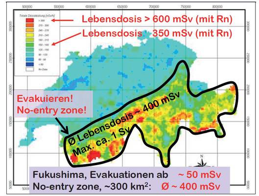 Fazit: Radioaktive Abfälle sind nur in den ersten Jahrhunderten gefährlich, die danach verbleibenden langlebigen Isotope haben eine zu geringe spezifische Aktivität, um noch ein Problem darzustellen. Grenzwerte sind unvernünftig niedrig, sie bedeuten, dass man große Teile der Schweiz evakuieren müsste, siehe Abbildung. Der Schluss von Herrn Rüegg: Es gibt Hoffnung. »Aber auch der Hexenglaube fand einmal sein Ende.«