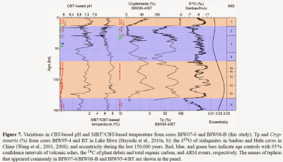 Der Vergleich mit Pollenansammlungen in Bohrkernen aus dem Biwa-See zeigt, dass der pH von Seewasser durch die Sommertemperaturen in Zeiten geringer Exzentrizität bestimmt worden ist, während er in Zeiten hoher Exzentrizität durch die Sommerniederschläge bestimmt worden ist. Von vor 130.000 bis 55.000 Jahren lief der pH-Wert des Sees (Sommerniederschlag) hinter dem der sommerlichen Temperatur um viele tausend Jahre hinterher.