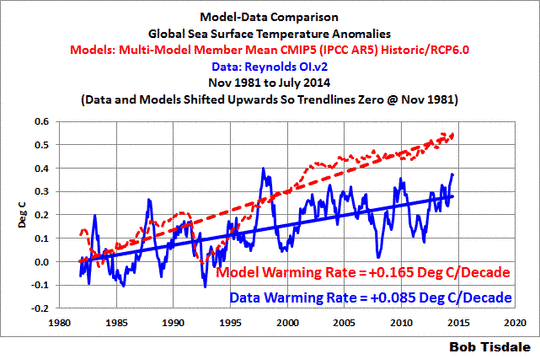 Aber was Stefan Rahmstorf nicht erwähnt, ist die Tatsache, dass die Ozean-Oberflächen nicht kooperieren mit den vom IPCC im 5. Zustandsbericht verwendeten Klimamodellen. Während der letzten über drei Jahrzehnte hat sich die Ozeanoberfläche mit einer Rate erwärmt, die nur etwa halb so groß ist wie die von den Klimamodellen simulierte. Siehe Abbildung 2: