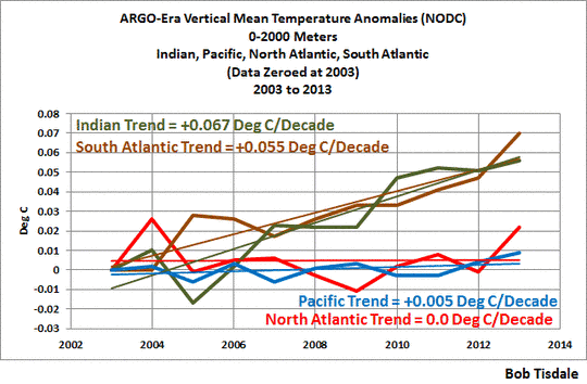 Und sie stützen nach wie vor nicht die hypothetische, vom Menschen verursachte globale Erwärmung. In einem offenen Brief an Kevin Trenberth – NCAR (hier) habe ich eine aktualisierte Graphik der vertikalen mittleren Temperatur-Anomaliedaten von NODC für den Indischen, den Pazifischen, den Nord- und Südatlantischen Ozean präsentiert, und zwar in Tiefen zwischen 0 und 2000 Metern aufgrund der ARGO-Messungen (die 2003 begonnen haben). Siehe Abbildung 3 unten (= Abbildung 5 im verlinkten Beitrag). Der flache Verlauf des Trends im Pazifik zeigt, dass es keinen substantiellen Anstieg der Wassertemperatur unterhalb der Oberfläche des Pazifiks gegeben hat, und zwar bis zu einer Tiefe von 2000 Metern während der letzten 11 Jahre. Im Nordatlantik war es genauso. Anthropogene Treibhausgase können die Erwärmung im Südatlantik und dem Indischen Ozean nicht erklären, wenn sie offensichtlich keinerlei Einfluss auf die Erwärmung des Nordatlantiks und des Pazifiks bis zu 2000 Metern während der letzten 11 Jahre hatten.