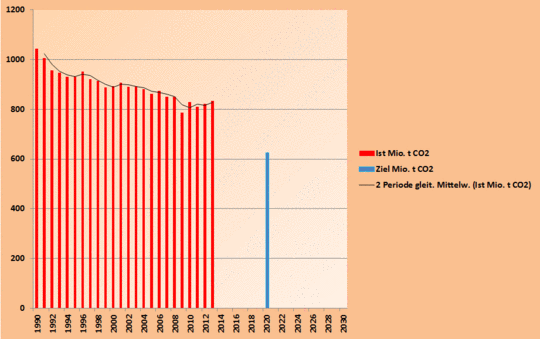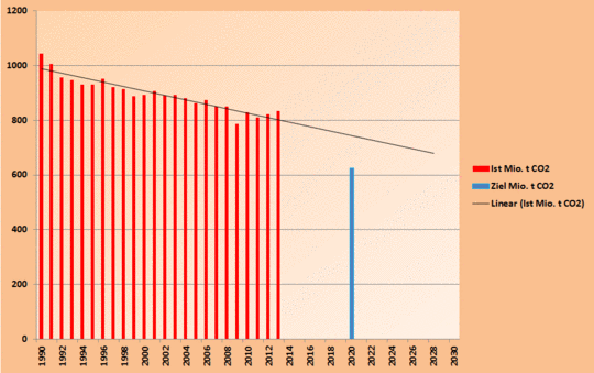 Berücksichtigt man also für die Berechnung eines linearen Trends alle Werte der Jahre von 1990 bis 2013, so erhält man eine Abnahmerate von 0,81 %/ Jahr. Bis 2020 erhielte man so eine Verringerung der Emissionen um 24,3 %, während der Wert für 2030 bei 32,4 % läge. Für eine politische Führung, die gerne als weltweites Vorbild in Sachen Klimaschutz wahrgenommen werden möchte, ist das keinesfalls ausreichend.