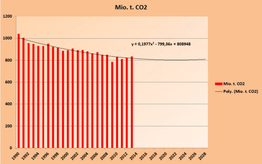 Darum ist ihre rein statistisch ermitteltes Polynom 2. Grades vermutlich auch nahe an der Wirklichkeit. Denn diese Einspareffekte sind bereits weitgehend abgefrühstückt. Ich sehe keinen Bereich, wo die noch fehlenden 200 Mio. t CO2 auch nur annähernd eingespart werden können.