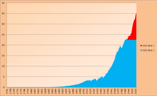 Bild 6 zeigt, wie sich der weltweite menschengemachte CO2-Ausstoß seit Beginn der Industrialisierung im 18./19. Jahrhundert verstärkt hat. Die Kurve lässt erkennen, wie sehr die Entwicklung unserer heutigen technischen Zivilisation mit der Möglichkeit der Nutzung von zusätzlichen, nicht-natürlichen Energieressourcen verknüpft ist. Mitte des 18. Jahrhunderts war der Mensch noch auf Holz, eigene Muskelkraft, Zugtiere und ein wenig Wind- und Wassermühlentechnik angewiesen. Ohne Motoren, Heizöl und Elektrizität könnte unser Planet schwerlich mehr als eine Milliarde Menschen ernähren, und selbst deren Lebensstandard wäre kümmerlich: Kalte Wohnungen, harte körperliche Arbeit, Mangelernährung, Seuchen, früher Tod im Kindbett, Zähne ziehen ohne Betäubung etc. etc.