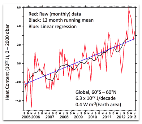 Abbildung 3: Globale Änderung des ozeanischen Wärmegehaltes (OHC) seit der vollständigen Ausbringung der ARGO-Bojen. Daten von der Wasseroberfläche bis in Tiefen von etwa 2000 Metern.