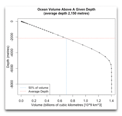 Abbildung 4: Ozeanvolumen in Abhängigkeit von der Tiefe. Nur wenige Ozeanbecken sind tiefer als 5 km.
