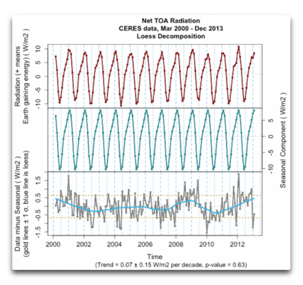 Nun, dies allein ist eine interessante Graphik. In der Gesamtstrahlung erkennt man die rund 20 W/m² ausmachende jährliche Schwingung der Erde zur Sonne hin und von ihr weg. Im Januar steht die Erde der Sonne am Nächsten, so dass die Erde in dieser Zeit Energie gewinnt, die sie in der anderen Jahreshälfte wieder verliert. Zusätzlich erkennt man die erstaunliche Stabilität des Systems. Entfernen wir erst einmal die monatlichen Mittelwerte, variiert das Gesamt-TOA-Ungleichgewicht nur mit einer Größenordnung von ± einem halben Watt pro Quadratmeter während der bislang 13 Jahre langen Aufzeichnung, ohne jeden statistisch signifikanten Trend … erstaunlich.