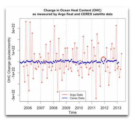 Mit anderen Worten, die Gesamt-TOA-Strahlung ist ein anderer Weg, mit dem wir die monatliche Änderung des ozeanischen Wärmegehaltes messen können. Folglich können wir einen Quercheck mit den OHC-Darstellungen durchführen. Er wäre nicht exakt, weil ein kleiner Teil der Energie sowohl auf dem Festland als auch im Eis gespeichert und wieder freigesetzt wird … aber der Hauptspeicher ist der Ozean. Also werden uns die CERES-Daten der Gesamt-TOA-Strahlung einen maximalen Wert für Änderungen der Ozeanspeicherung liefern, und zwar den Wert, den wir bei der Annahme bekommen, dass die gesamte Energie im Ozean gespeichert wird.