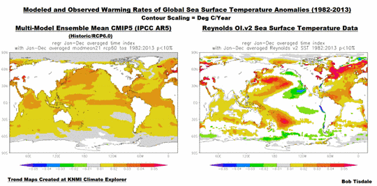 Und man findet NICHTS, das hilft, die räumliche Verteilung der Erwärmung der Ozeane in den Klimamodellen festzumachen, so dass die Modelle nützlich sein könnten, zukünftige Klimaabläufe auf dem Festland zu simulieren (Temperatur und Niederschlag). Siehe Abbildung 2: