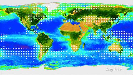 Bild 3 Grün sind die Zonen mit viel Pflanzenwuchs. Im Sommer erreichen die Kohlendioxid-Konzentrationen über Nordamerika, Europa und Asien ein Minimum. Nur wenige weiße Quadrate zeigen dies an.