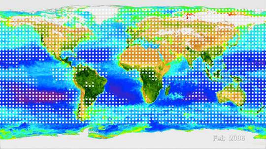 Bild 2, Die Animation im Video (Bitte in der Originalseite anklicken) zeigt die globale durchschnittliche Kohlendioxidkonzentration von September 2002 bis September 2006, sie erhöhte sich von 374 auf 383 ppm (Anteile pro Million – dieses sind 0,0383 Prozent)