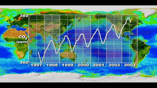 Die NASA bietet gute Information zur Korrelation zwischen Kohlendioxid-Konzentration der Troposphäre und den jahreszeitlichen Schwankungen der Biosphäre. CO2 und seine Rolle für das Leben auf der Erde. Die folgende Visualisierung basiert auf Daten des MODIS Instrument über vier Jahre Kohlendioxid-Messungen des Atmospheric Infrared Sounder (AIRS) im Aquasatelliten der NASA, zeigt, wie Kohlendioxid-Konzentrationen schwanken aufgrund der Vegetation an Land. Die blinkenden weißen Quadrate stellen den Kohlendioxidgehalt in der Atmosphäre dar. Beachten Sie den starken Rückgang der Quadrate wenn die Vegetation während des Sommers auf der Nordhalbkugel gedeiht. Umgekehrt führen im Winter die Verluste an vorhandener Vegetation zu steigenden Kohlendioxid-Werten auf der ganzen Welt.