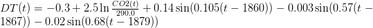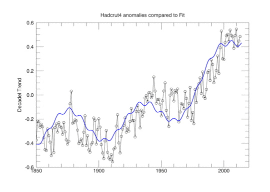 Abbildung 1 zeigt, dass die Bodendaten gut durch eine Formel (beschrieben hier) beschrieben werden können, die sowohl einen Term des Gesamt-CO2-Antriebs als auch einen Term der 60-Jahre-Oszillation enthält. Diese Formel lautet: