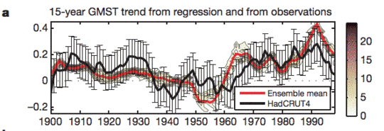 Die jüngste Studie in dem Magazin Nature von Jochem Maritzke & Piers Forster mit dem Titel „Antrieb, Rückkopplung und interne Variabilität in globalen Temperaturtrends“ hat viel Aufmerksamkeit erregt, weil sie die Behauptung aufstellt, dass Klimamodelle gut sind und diese die Erwärmung trotz der beobachteten 17 Jahre Stillstand seit 1998 nicht überschätzen. Sie versuchen, dies zu belegen, indem sie zeigen, dass 15-Jahre-Trends in den HadCRUT4-Daten in CMIP5-Modellen erwartet werden können durch eine quasi zufällige interne Variabilität, während irgendwelche 60-Jahre-Trends deterministisch sind (anthropogen). Sie identifizieren ,deterministisch‘ und ,interne Variabilität‘ in den Modellen mittels einer Multi-Regressionsanalyse mit ihren bekannten Antrieben als Input.