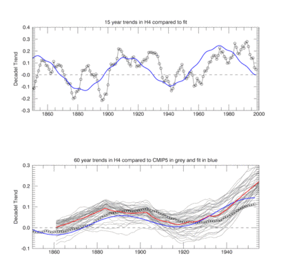 Erstens, die Hypothese, dass die gesamte interne Variabilität quasi-zufälliger Natur ist, ist wahrscheinlich falsch.Tatsächlich gibt es eindeutige Beweise einer 60-jährigen Oszillation in den GMST-Daten, [Global Mean Surface Temperature] möglicherweise im Zusammenhang mit AMO/PDO – siehe bei realclimate. In diesem Sinne sind vermutlich alle Modelle falsch, weil sie diese nicht-zufällige Verteilung nicht enthalten. Zweitens, wie ich zeigen werde, sind die beobachteten 15-Jahre-Trends bei HadCRUT4 selbst nicht quasi-zufällig. Drittens, ich zeige, dass die beobachteten 60-Jahre-Trends nach 1945 von den Modellen kaum beschrieben werden und dass im Wesentlichen alle Modelle bis 1954 höhere Trends prophezeit haben als beobachtet worden sind. Dies bedeutet, dass die ,deterministische‘ Komponente aller CMIP5-Modelle tatsächlich die GMST-Reaktion auf Treibhausgas-Konzentrationen überschätzen.