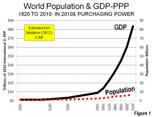 Wendell Cox bei New Geography hat sorgfältig den Trend herausgearbeitet, den er beschreibt als „schnelles Bevölkerungswachstum und noch schnelleres wirtschaftliches Wachstum“. Er fasst es zusammen in der folgenden Graphik. Die Graphik beginnt im Jahre 1820, etwa zu Beginn der industriellen Revolution, und was wir im Grunde sehen ist, dass das Wachstum von Produktion und Wohlstand das Wachstum der Bevölkerung im Verlauf von zwei Jahrhunderten überflügelt hat.