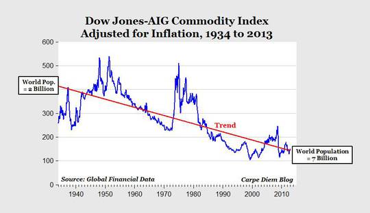 Mark Perry zeigt eine Graphik des langzeitlichen Trends, der zeigt, wie ein Warenindex, der die Preise von Dingen wie Öl, Metallen und Vieh reflektiert, um über die Hälfte zurückging mit der gleichzeitigen Vermehrung der Bevölkerung von 2 Milliarden auf 7 Milliarden.