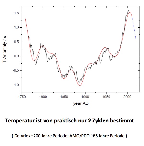 Er belegt auch, wie die Temperatur der letzten 300 Jahre von nur 2 Zyklen bestimmt wird. Langfristig dominierend ist der ~200 Jahre Zyklus als der bekannte De Vries Zyklus der Sonnenaktivität. Diesem überlagert ist die bekannte, kurzfristigere irdische AMO/PDO- Oszillation mit ~65 Jahren Periode. Der zyklische Charakter des