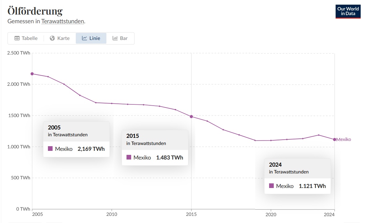 Auch in Mexiko ging die Erdölförderung extrem zurück über die Jahre.