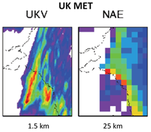 Die räumliche Auflösung moderner numerischer Wettervorhersage-Modelle ist notwendigerweise viel feiner. Der neueste, 2012 installierte Wetter-Supercomputer des UK Met.-Office und deren assoziierte Modelle verwenden eine grobe Auflösung von 25 km (NAE) für Prädiktanten wie Druckgradienten {Wind} und frontale Grenzschichten sowie eine Feinauflösung (UKV) von 1,5 km für Parameter wie Niederschlag (für regionale Überschwemmungs-Warnungen). Die Website des UKMO zeigt stolz dieses Beispiel: