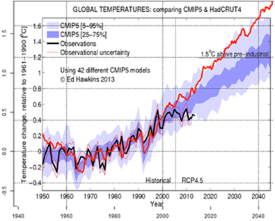 Keines dieser Statements entspricht der Wahrheit, wie die inzwischen berüchtigte Divergenz zwischen CMIP5 und dem Stillstand beweist (siehe unten Abbildung 7). Der CO2-Gehalt ist weiter gestiegen, die Temperatur nicht.