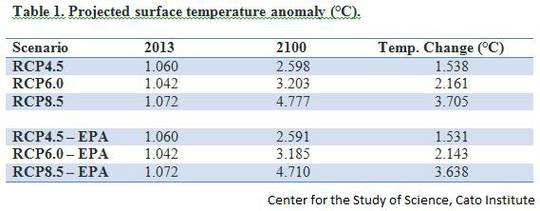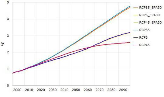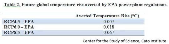 Der Anstieg der projizierten zukünftigen Temperatur, der durch die EPA-Restriktionen auf die CO2-Emissionen bestehender Kraftwerke vermieden wird, beträgt zwischen jetzt und dem Ende dieses Jahrhunderts weniger als 0,02°C, wenn man das mittlere, vom IPCC definierte Emissions-Szenario zugrunde legt.
