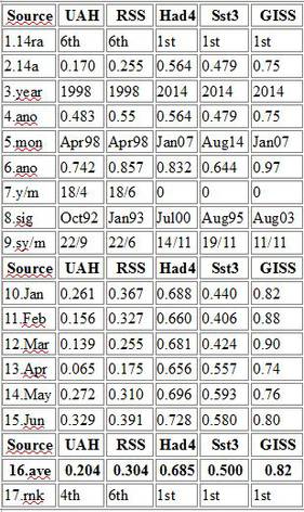 In den folgenden Abschnitten sollen wie zuvor die jüngsten Fakten gezeigt werden. Die Informationen werden in drei Abschnitten und einem Anhang dargelegt. Der erste Abschnitt wird zeigen, wie lange einige Datensätze keine Erwärmung mehr zeigen. Im Moment haben nur die Satellitendaten flache Verläufe über mehr als ein Jahr. Im zweiten Abschnitt wird gezeigt, wie lange viele Datensätze keine statistisch signifikante Erwärmung mehr zeigen. Im dritten Abschnitt wird gezeigt, wie sich das Jahr 2015 derzeit im Vergleich zum Jahr 2014 sowie den wärmsten Monaten und Jahren jemals macht. Für drei der Datensätze war 2014 das wärmste Jahr. Im Anhang werden die Abschnitte 1 und 2 auf andere Weise illustriert. Graphiken und eine Tabelle sollen den Sachverhalt verdeutlichen.