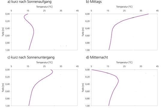 Diese für feste Körper geltenden Zusammenhänge treffen in eingeschränkter Form auch für Konglomerate bzw. Haufwerke fester Körper wie z.B. wie Sand oder Erdreich zu. Die geringe Geschwindigkeit der Wärmeübertragung ist dabei für das Nachvollziehen von Wetter- und Klimavorgängen von Vorteil. Einen Eindruck von der Trägheit dieser Vorgänge vermittelt der Tagesgang der Temperaturprofile im Boden zwischen Oberfläche und 1 m Tiefe an einem typischen Sommertag, Bild 2.